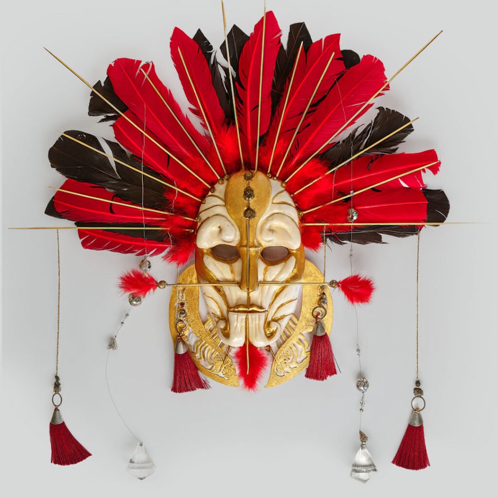 Descripción: La máscara del oráculo, inspirada en culturas indígenas venezolanas, representa la sabiduría y espiritualidad a través de un rostro sereno con marcas que simbolizan el vínculo con el mundo espiritual y el dios sol Wei. Para esta tribu, Wei, es el padre de la humanidad y un ser supremo cálido que buscaba el bienestar entre el mundo espiritual y terrenal. El tocado de plumas y los adornos dorados de la máscara, evocan la autoridad y el poder de un ser iluminado, haciendo de esta pieza un reflejo de las tradiciones ancestrales.